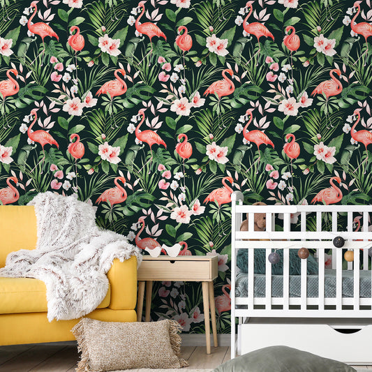 Pink Flamingo Tropical Jungle Palm Leaf Wallpaper