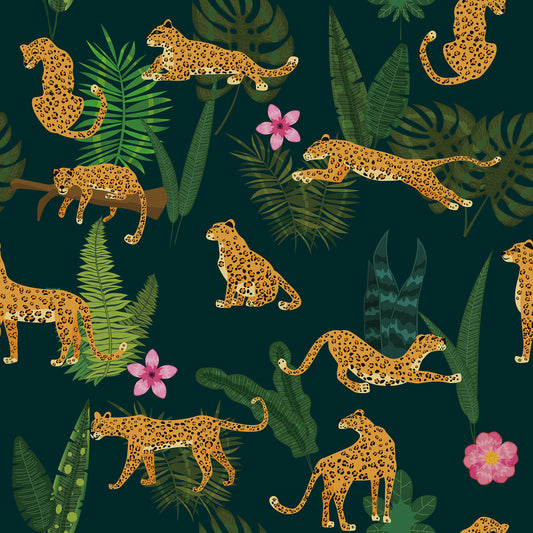Dark Green Jungle Animal Leopard King Floral Wallpaper