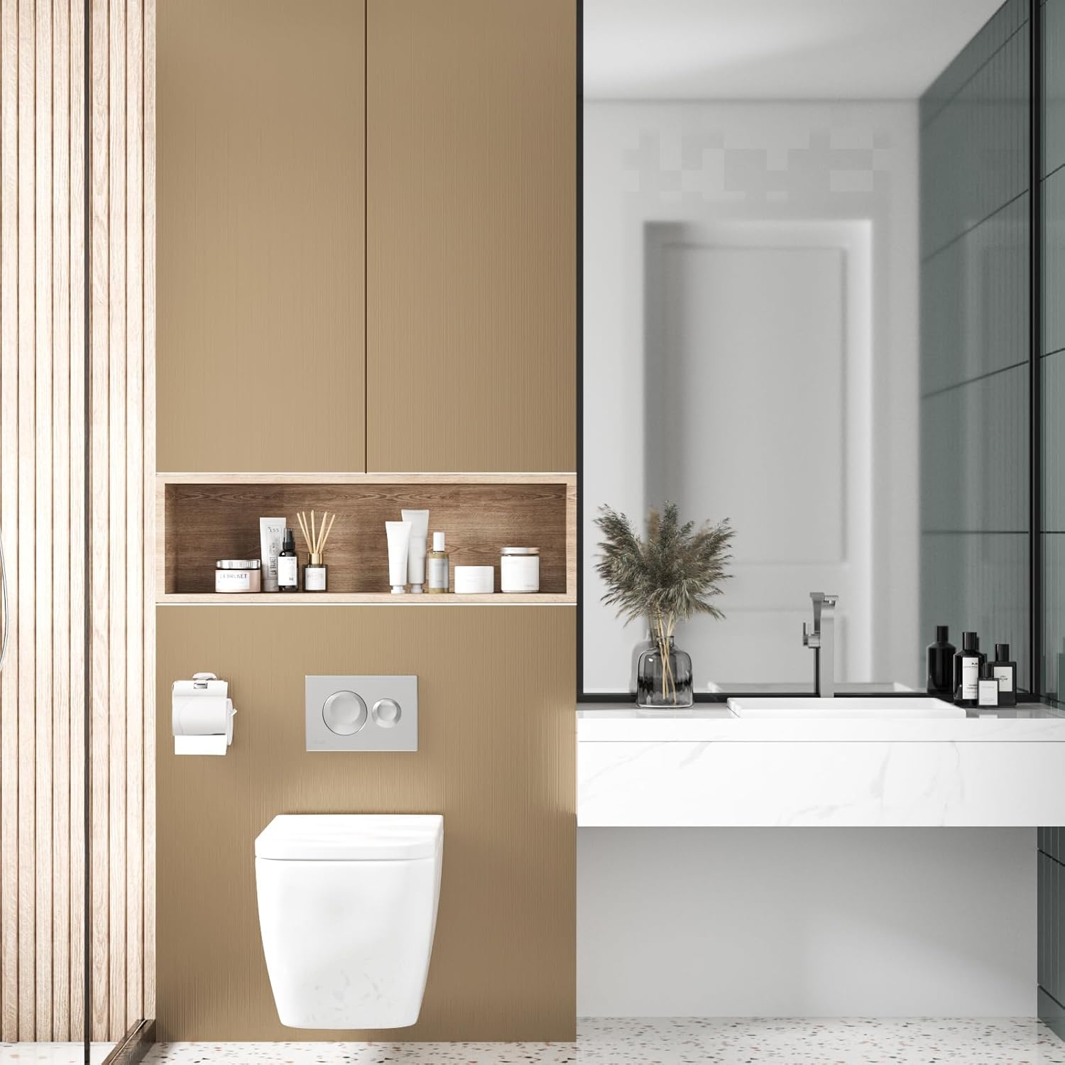 WARM TIPS- This champagne gold peel and stick wallpaper is suitable for smooth and clean surfaces only. Avoid applying to textured or dirty surfaces as it may impact adhesion