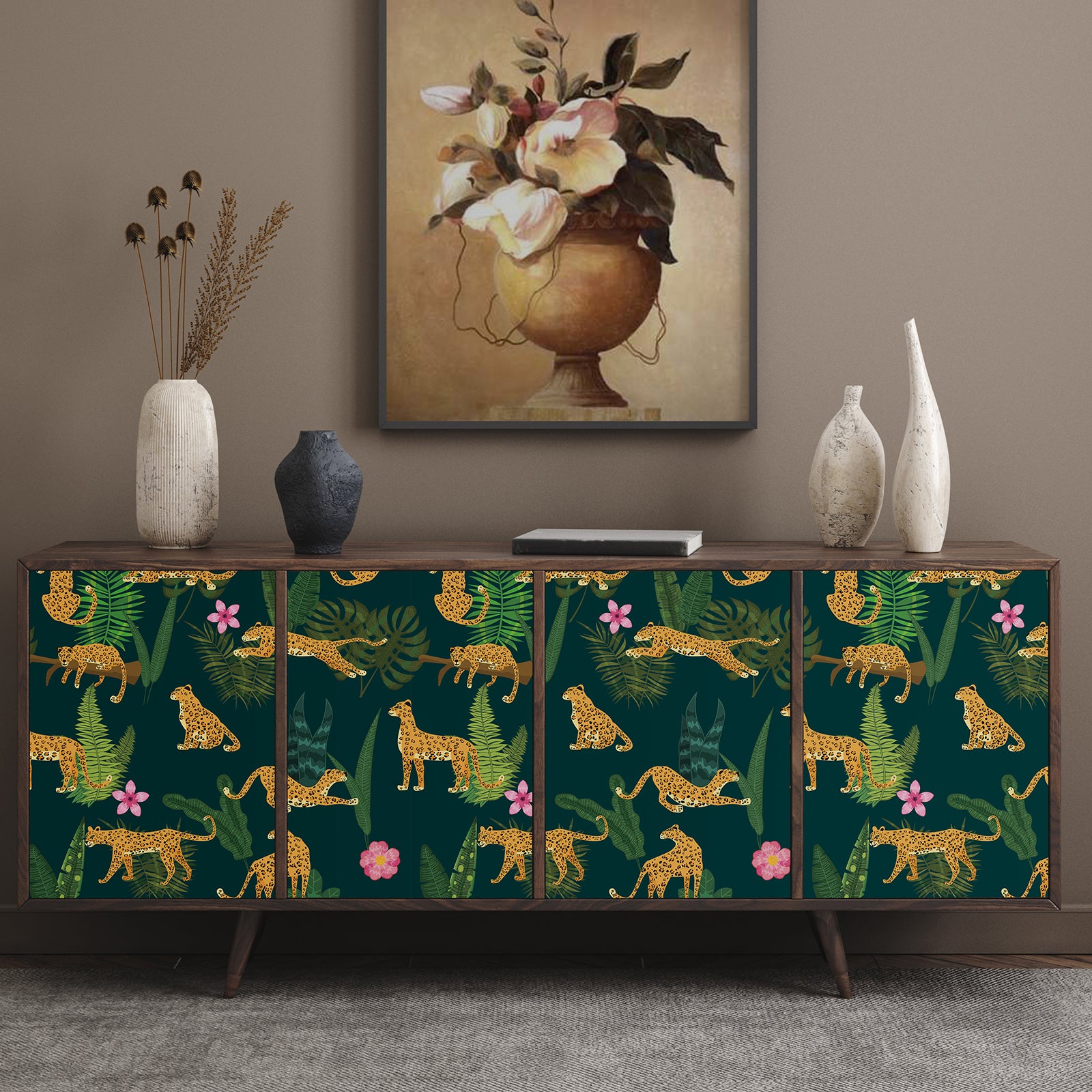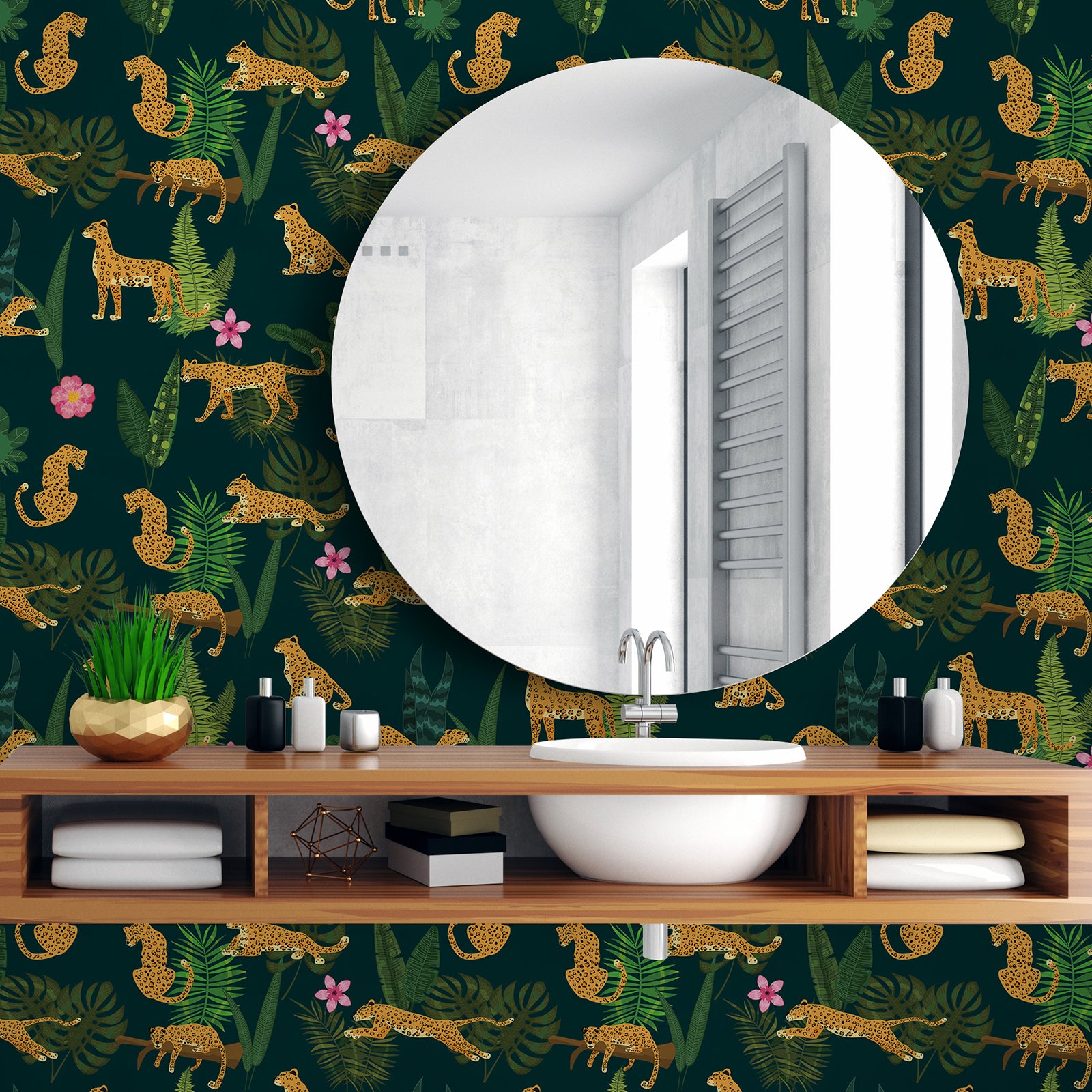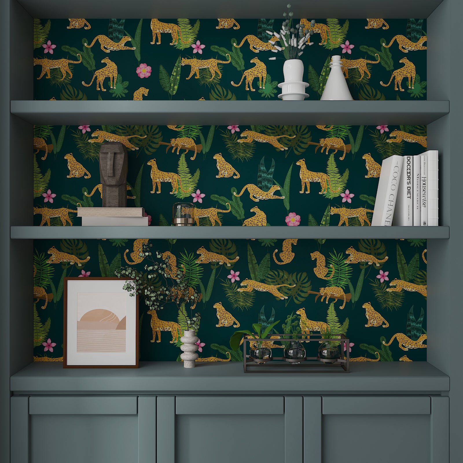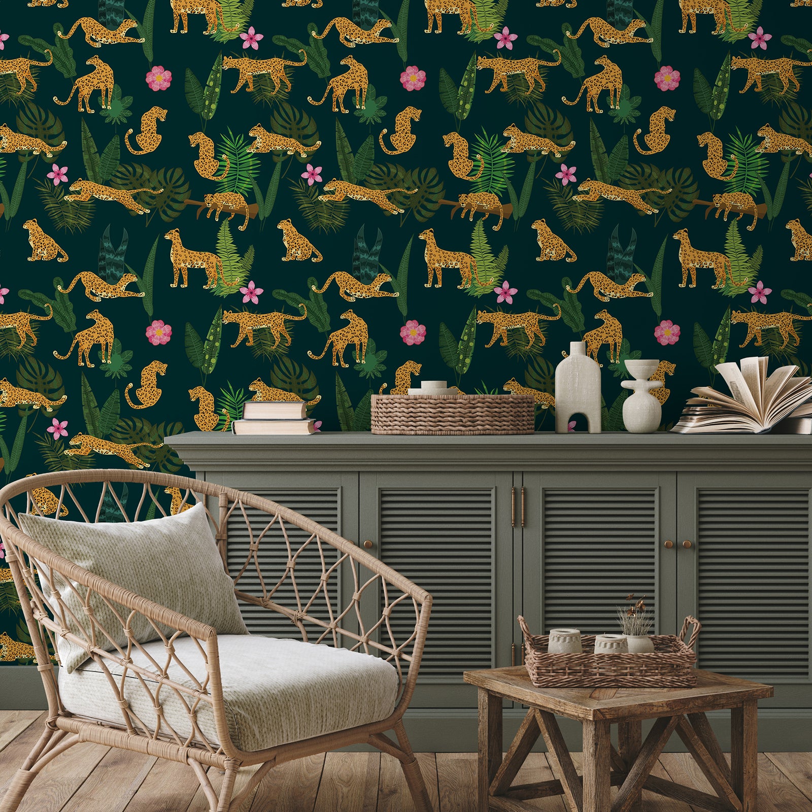 Dark Green Jungle Animal Leopard King Floral Wallpaper