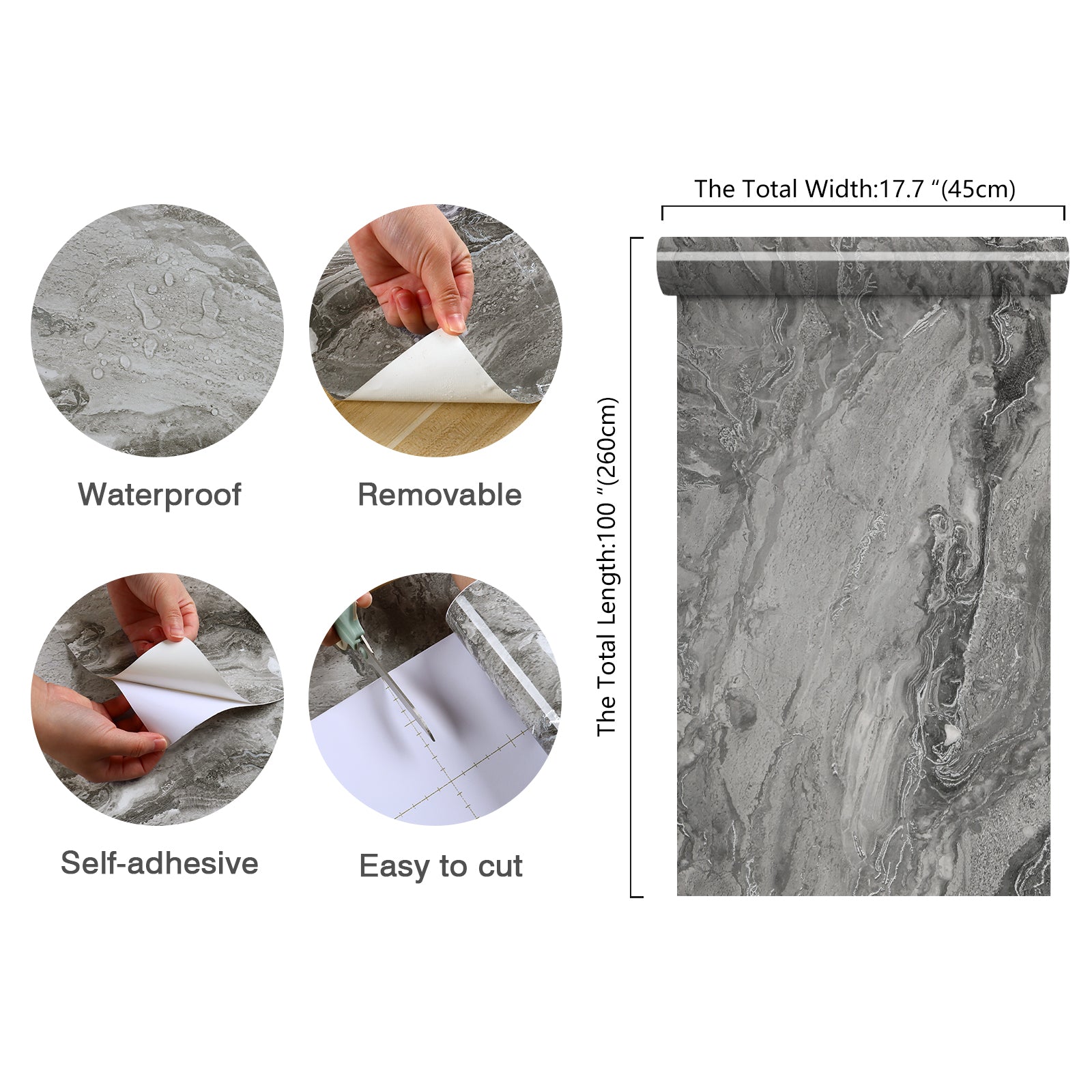- 【Size & Material】The size of our light grey marble contact paper measures 17.7 in x 100 in, covering approximately 12.5 sq.ft. It is made of premium quality and durable vinyl material, ensuring it is waterproof and tear-resistant
