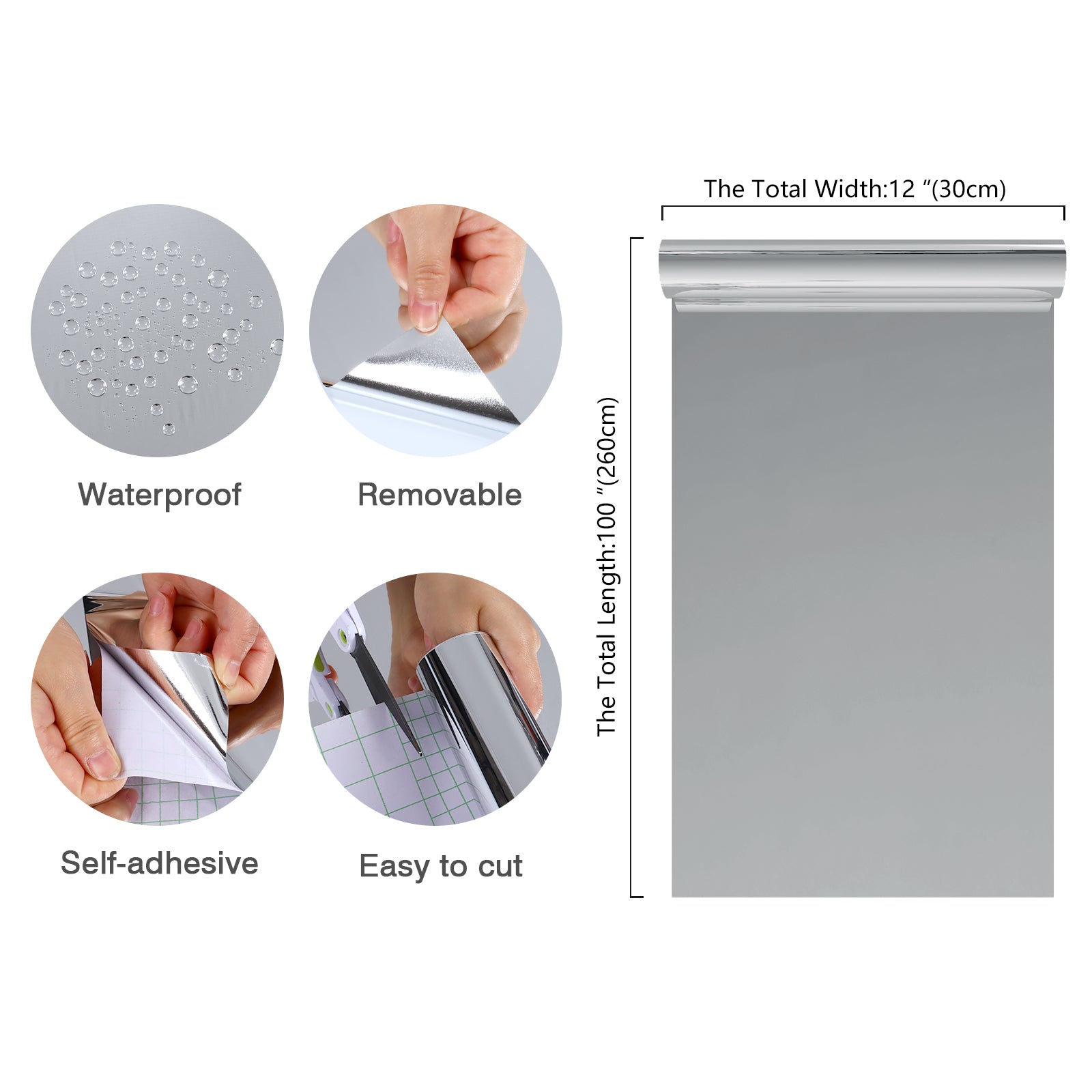 - 【Mirror Stickers for Walls】Each roll measures 12" x 100" and covers 8.39 sq.ft. Made of thick PET material, these non-glass reflective silver mirror stickers are perfect for adding a touch of elegance to any room