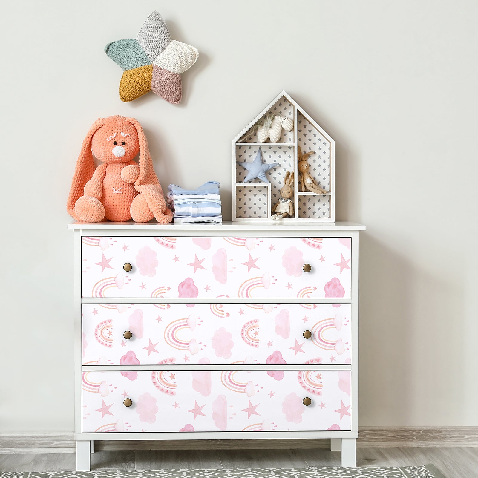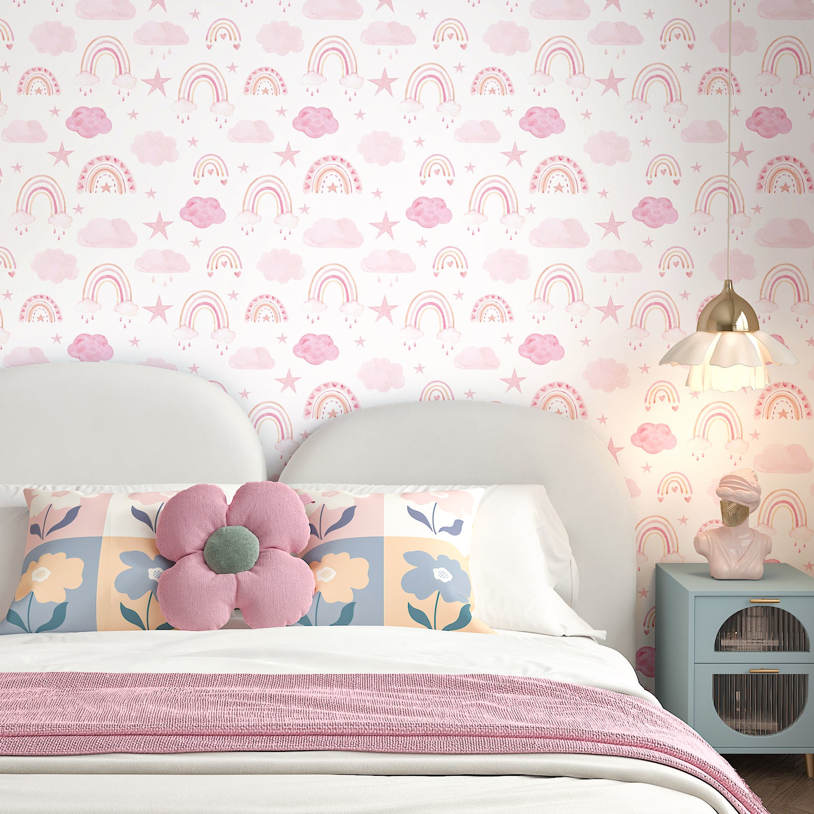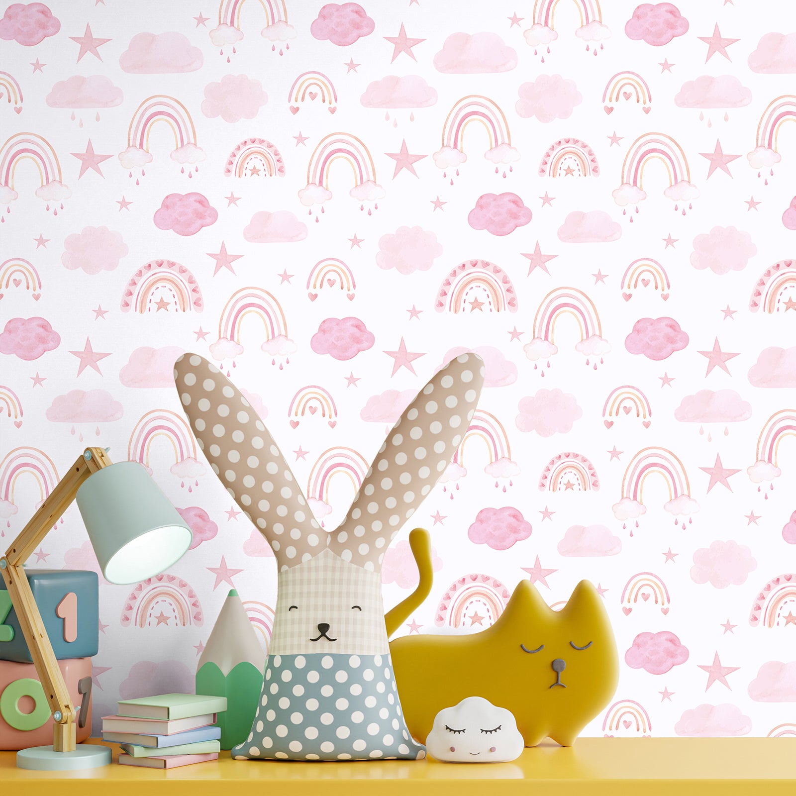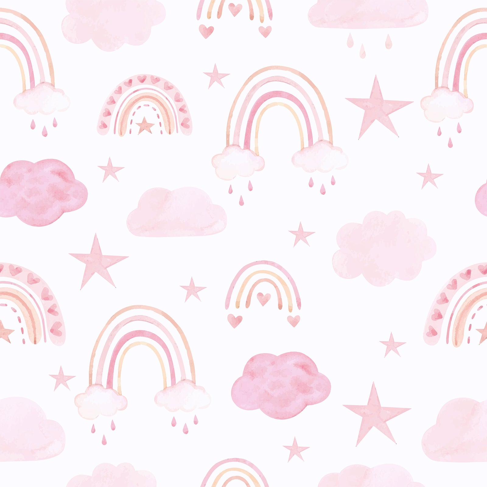 - Design: This boho wallpaper with a watercolor pink rainbow, cloud, and star pattern on a pastel white background, adds a playful and cute touch to any nursery or kid's room. Easy to apply, perfect for renters or those who like to update their decor frequently