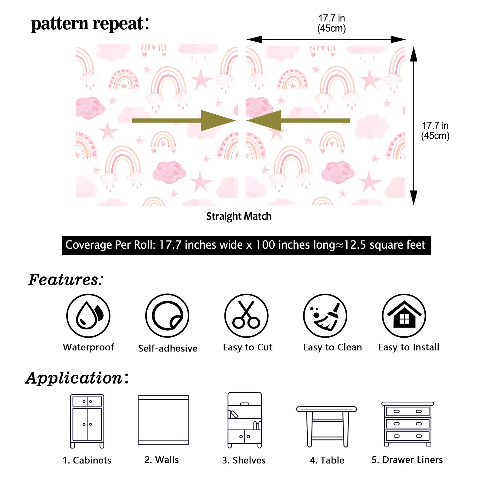- Size and Material: Each pink rainbow peel and stick wallpaper is 17.7" wide x 100/236" long, covering 12.5/38.75 square feet. Made of high quality self-adhesive vinyl material, this wallpaper is waterproof and fade resistant, ensuring long-lasting beauty even in humid environments. Pattern repeat, straight match, first find the correct pattern repeat and then just match directly without overlapping